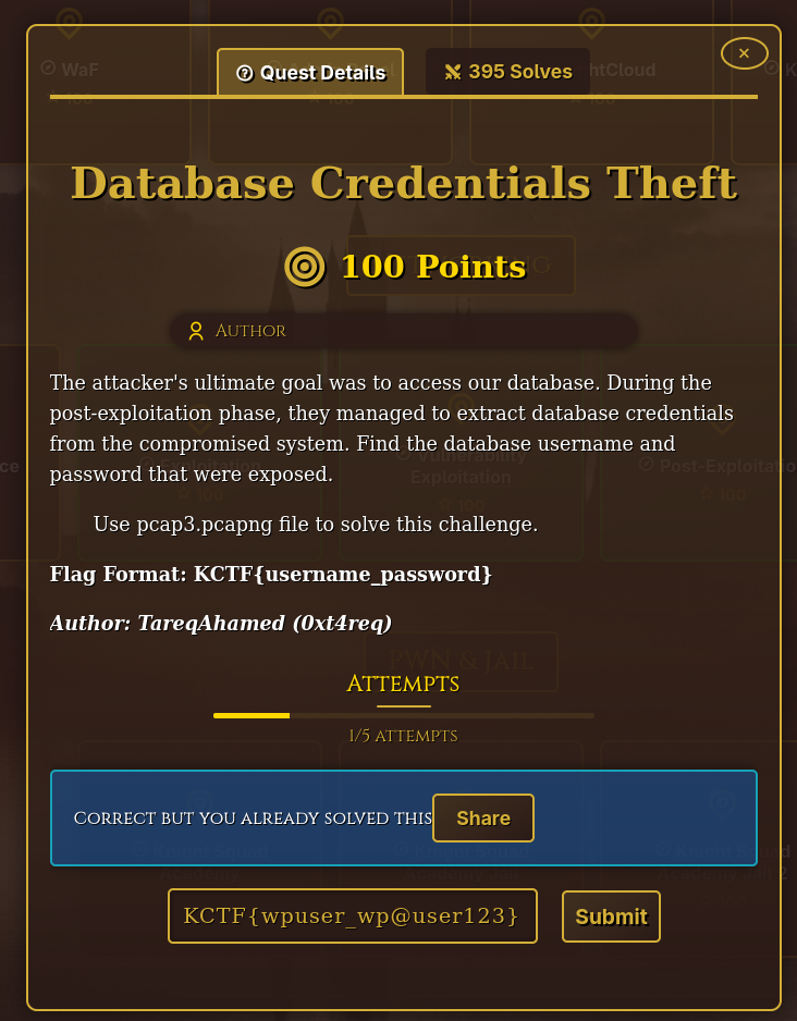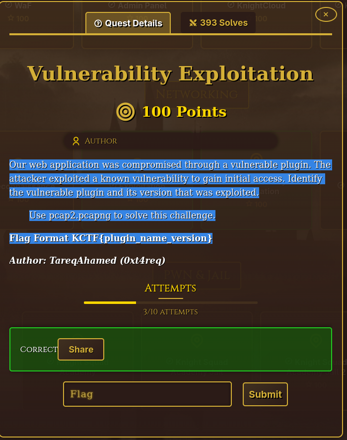 ~/Vault/isec/ctf/knight2k26/net100-exploitation β $ tshark -r pcap2.pcapng -Y 'frame contains "wp-content/plugins"' -T fields -e frame.time -e ip.src -e http.request.uri