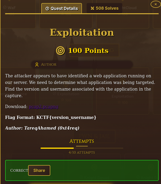 ~/Vault/isec/ctf/knight2k26/net100-exploitation β $ tshark -r pcap2.pcapng --export-objects http,./dump