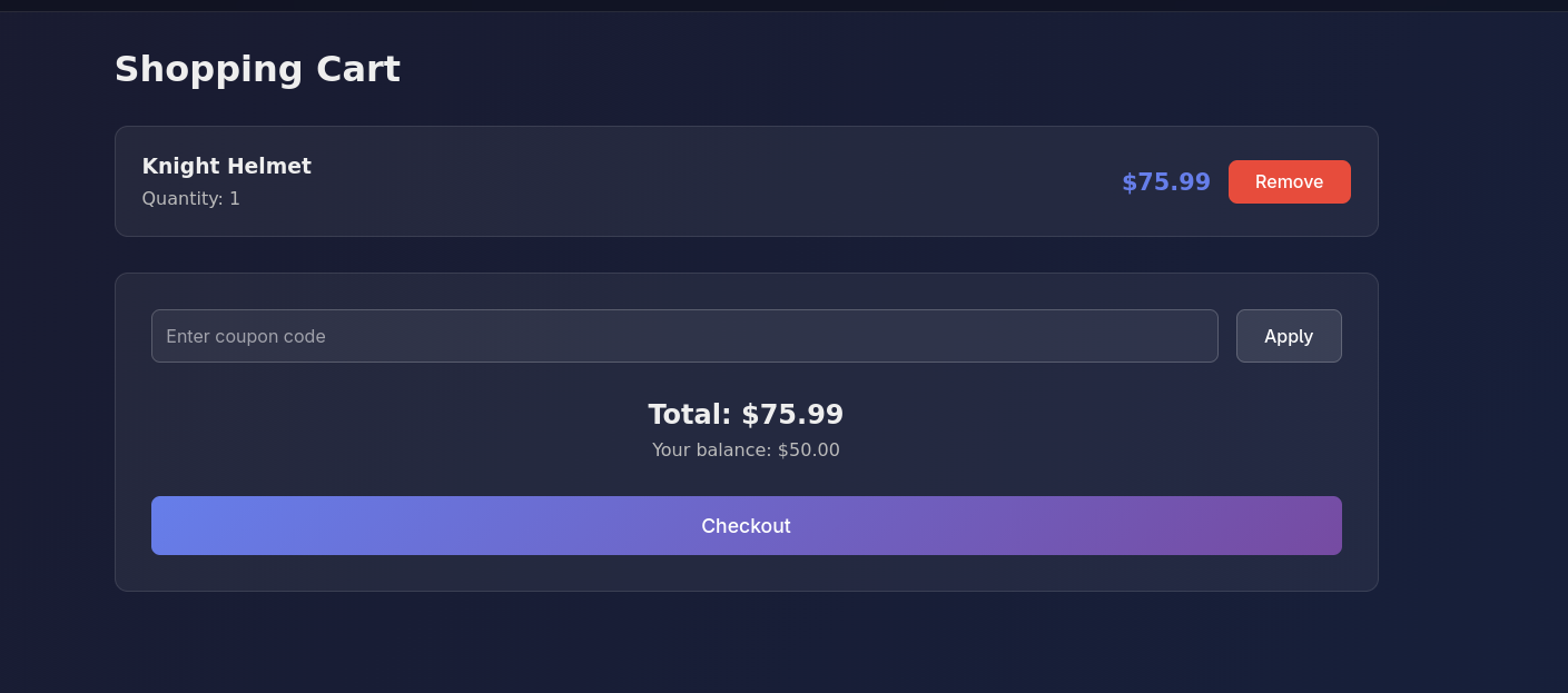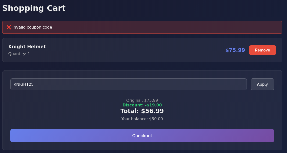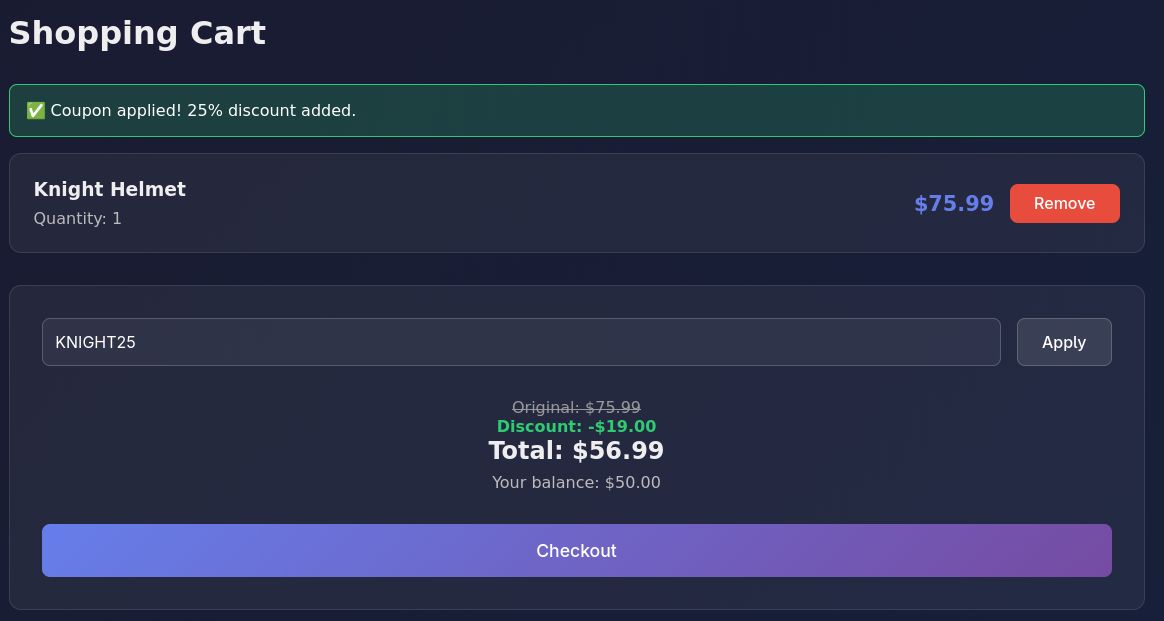 Now we will apply the coupon code: KNIGHT25. But even with that discount we wont have enough balance to place an order.
