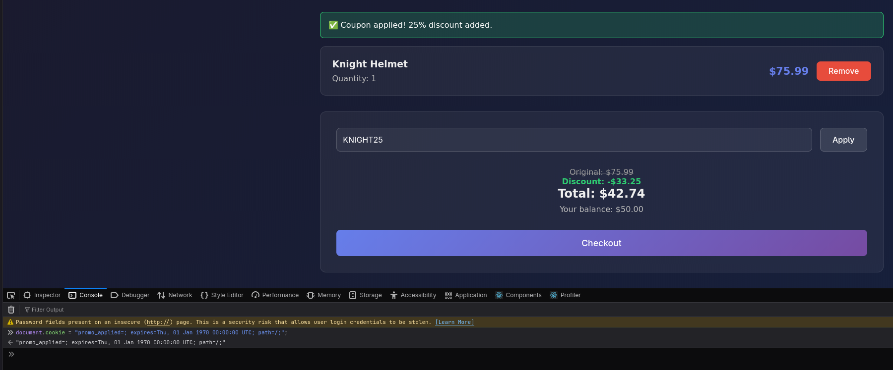 base = [75,78,73,71,72,84] β ASCII = K N I G H T suffix = [50,53] β ASCII = 2 5- If the discount code is applied successfully it will set the cookie promo_applied to prevent reuse of the same coupon code.