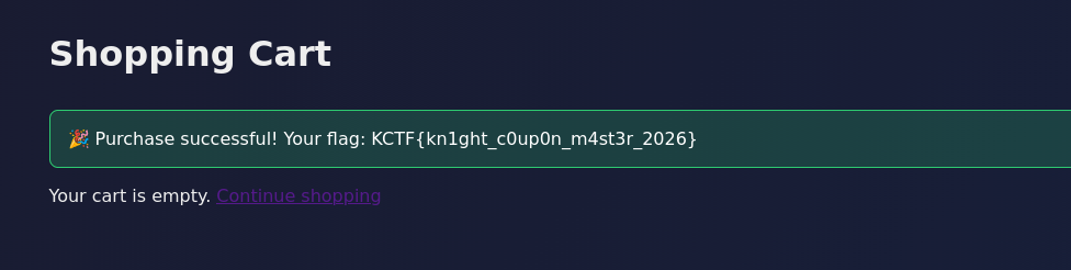 Flag is: KCTF{kn1ght_c0up0n_m4st3r_2026}