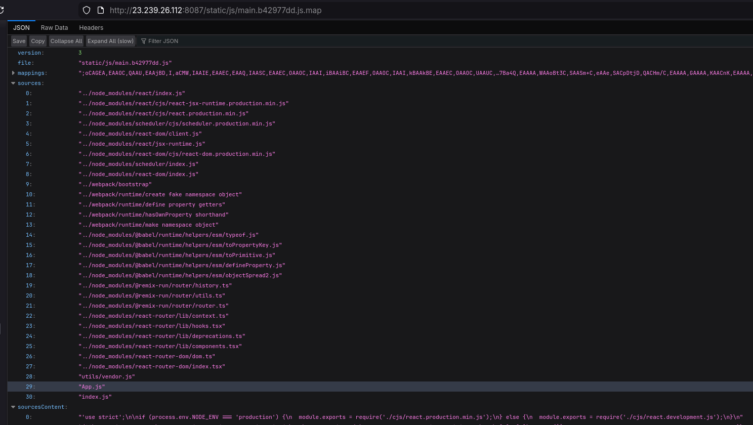 Opening a .js.map file shows us all of the imports and their sources in this ReactJS app. Ignoring default imports, we're mostly interested in App.js, index.js and vendor.js.